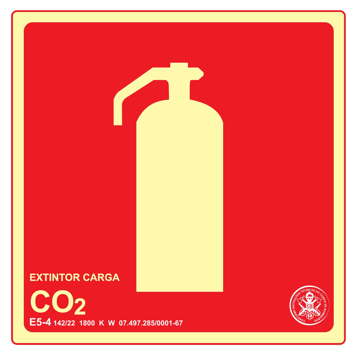 A placa de sinalização E5-4 significa "Extintor Carga CO2" que usa dióxido de carbono para apagar fogo, sendo eficaz para incêndios em líquidos inflamáveis (Classe B) e em equipamentos elétricos energizados (Classe C). Ele funciona por meio do abafamento, deslocando o oxigênio e também pelo resfriamento, pois o gás liberado é muito frio. A vantagem principal é que ele não deixa resíduos, sendo ideal para proteger equipamentos eletrônicos sensíveis.
