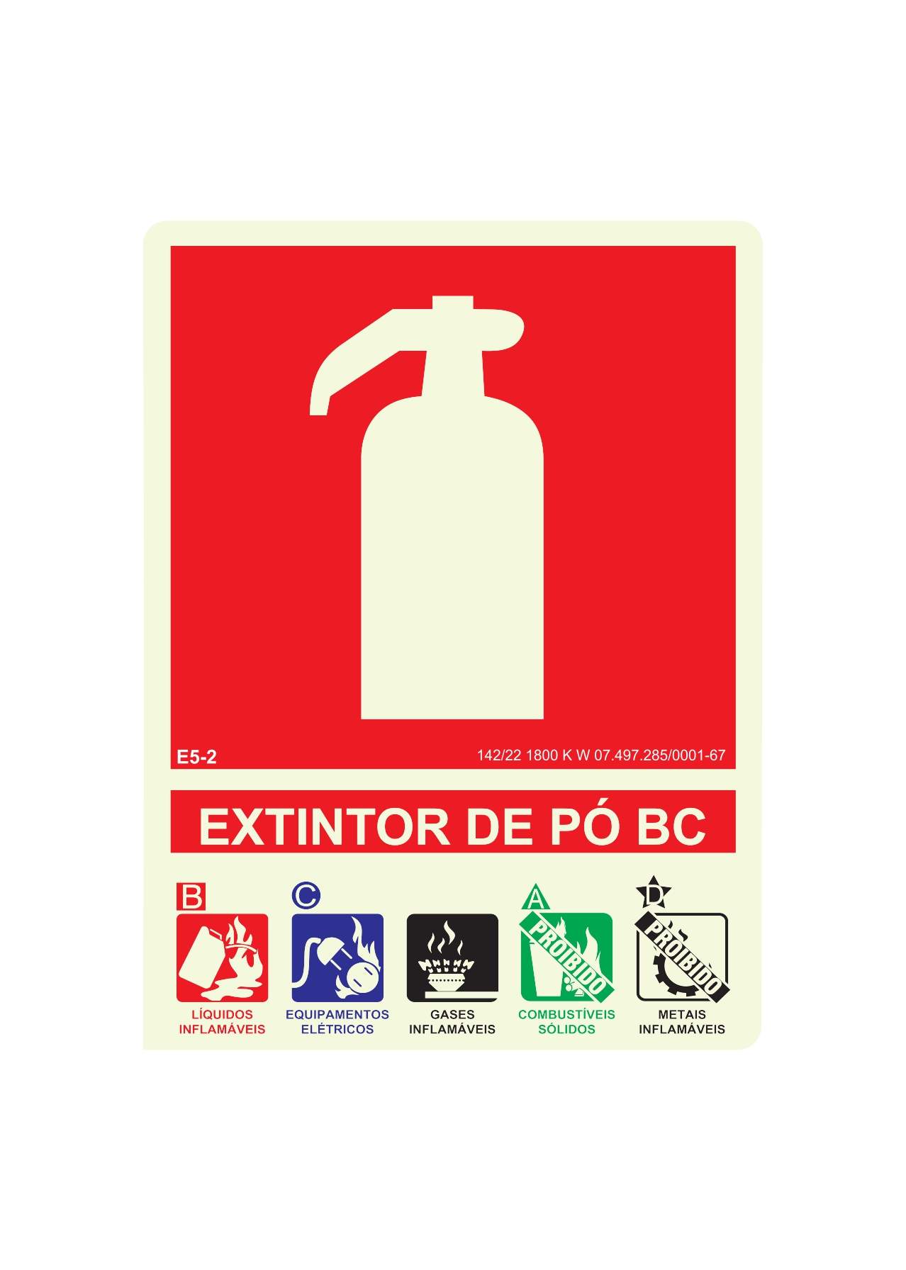 A placa de sinalização E5 -2 possui o tamanho de 15x20cm e significa Extintor de Incêndio com Carga de Pó BC com Agente e Classes de Fogo e serve para identificar a localização de um extintor em uma edificação.