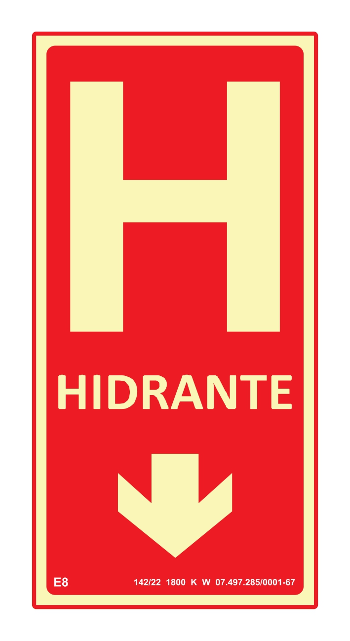 A placa E8 significa "Hidrante de Incêndio" e serve para indicar a localização de equipamentos de combate a incêndio. Geralmente tem fundo vermelho com o pictograma de uma mangueira ou da letra "H" em branco, e pode ser fotoluminescente para ser visualizada em ambientes com pouca luz.
