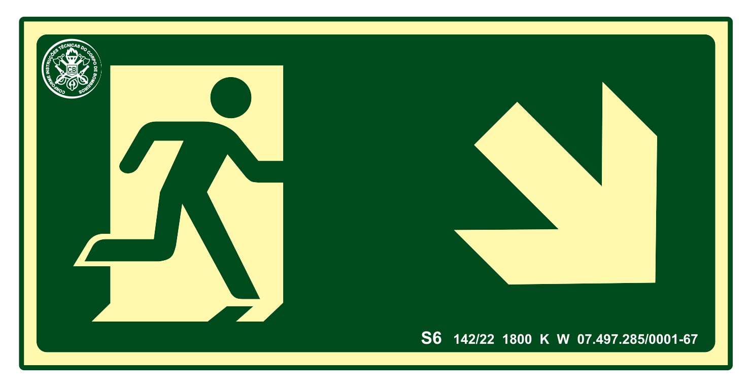 A função principal da placa S6 é indicar a direção da saída de emergência para desce à direita em rotas de fuga. Ela é uma sinalização de orientação e salvamento, essencial para guiar as pessoas durante uma evacuação rápida em situações de emergência, como incêndios ou falta de energia.