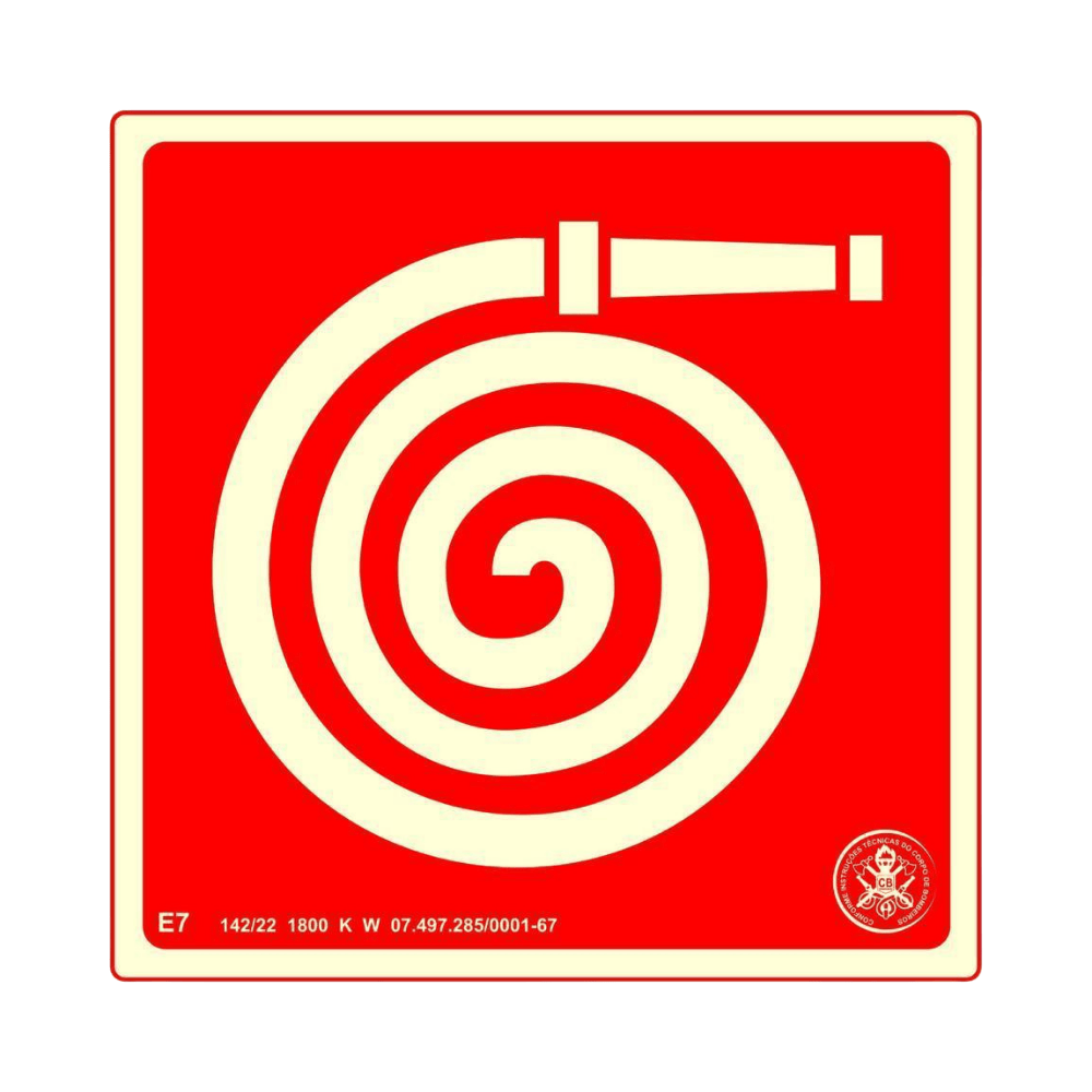 A Placa E7 Mangueira indica a localização de mangueiras de incêndio, sendo essencial para a segurança em edifícios e áreas industriais. Produzida em aço carbono, com acabamento fotoluminescente, ela garante visibilidade em ambientes com baixa luminosidade, atendendo às normas de segurança contra incêndios.