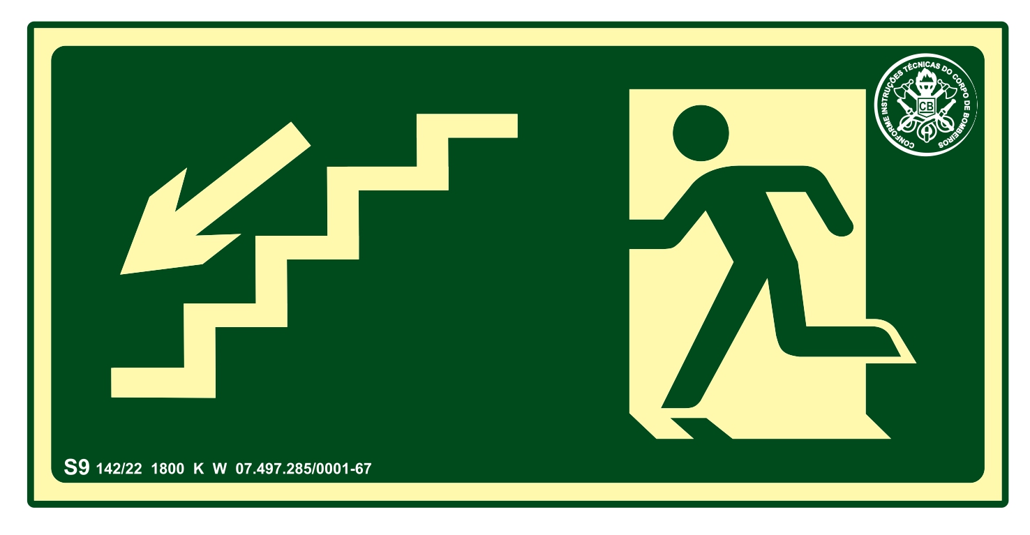 A função principal da placa S9 é indicar a direção da saída de emergência para desce escada à esquerda em rotas de fuga. Ela é uma sinalização de orientação e salvamento, essencial para guiar as pessoas durante uma evacuação rápida em situações de emergência, como incêndios ou falta de energia.