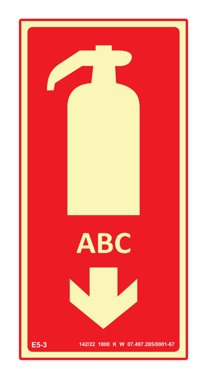 A placa de sinalização E5 -3  significa "Extintor Carga ABC" e serve para identificar a localização de um extintor com agente químico em pó, eficaz contra incêndio de classe A (materiais sólidos), classe B (líquidos inflamaveis) e C (equipamentos elétricos energiados) em uma edificação.