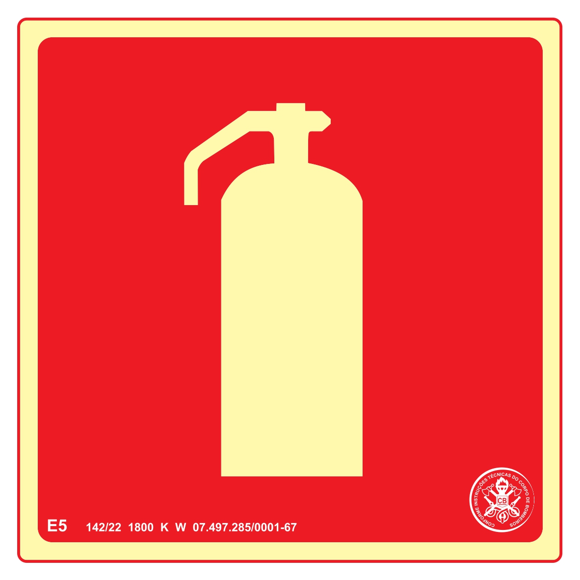 A placa de sinalização E5 significa "Extintor de Incêndio" e serve para identificar a localização de um extintor em uma edificação.