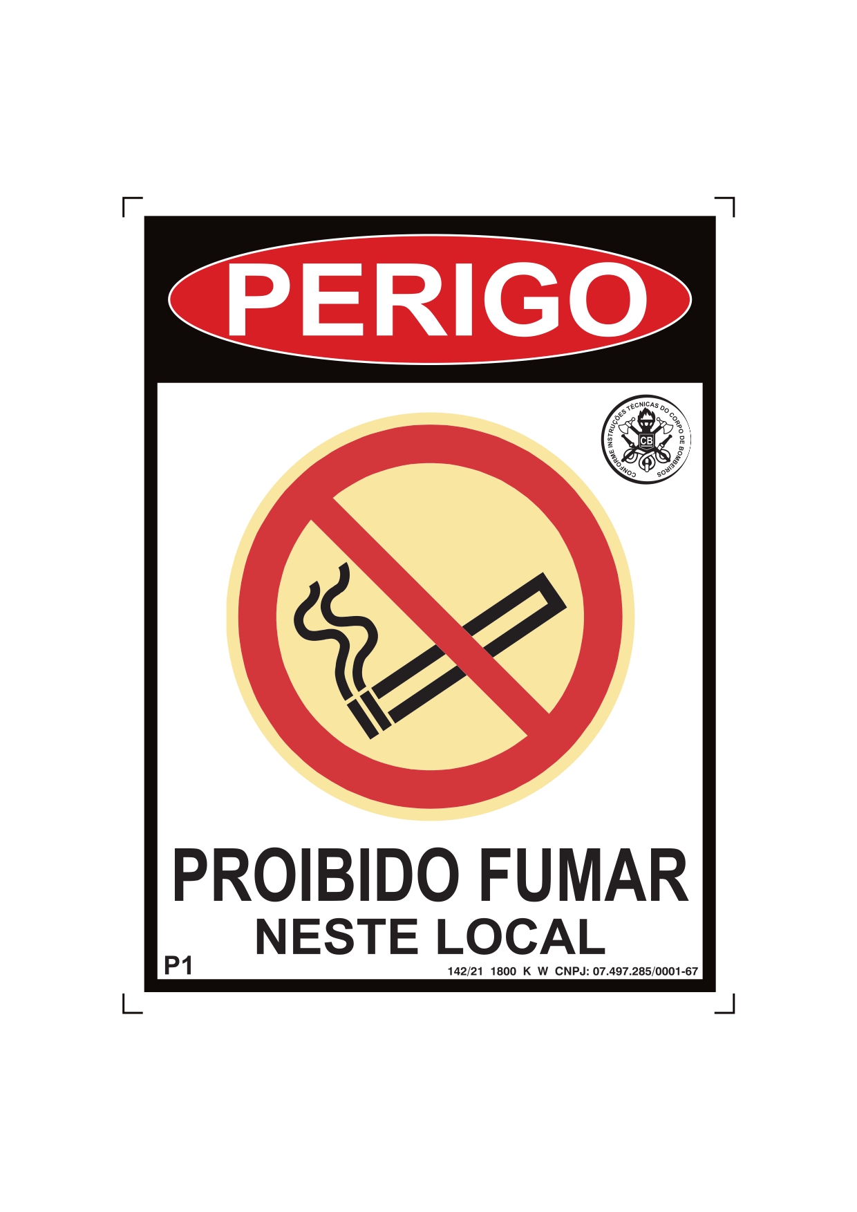 A placa P1 significa "Proibido Fumar" e é uma sinalização de segurança usada em locais onde acender um cigarro pode aumentar o risco de incêndio. Ela tem um símbolo circular vermelho com fundo branco e um pictograma de cigarro com um traço, indicando que a ação é proibida. Geralmente é feita de material fotoluminescente, o que faz com que brilhe no escuro.