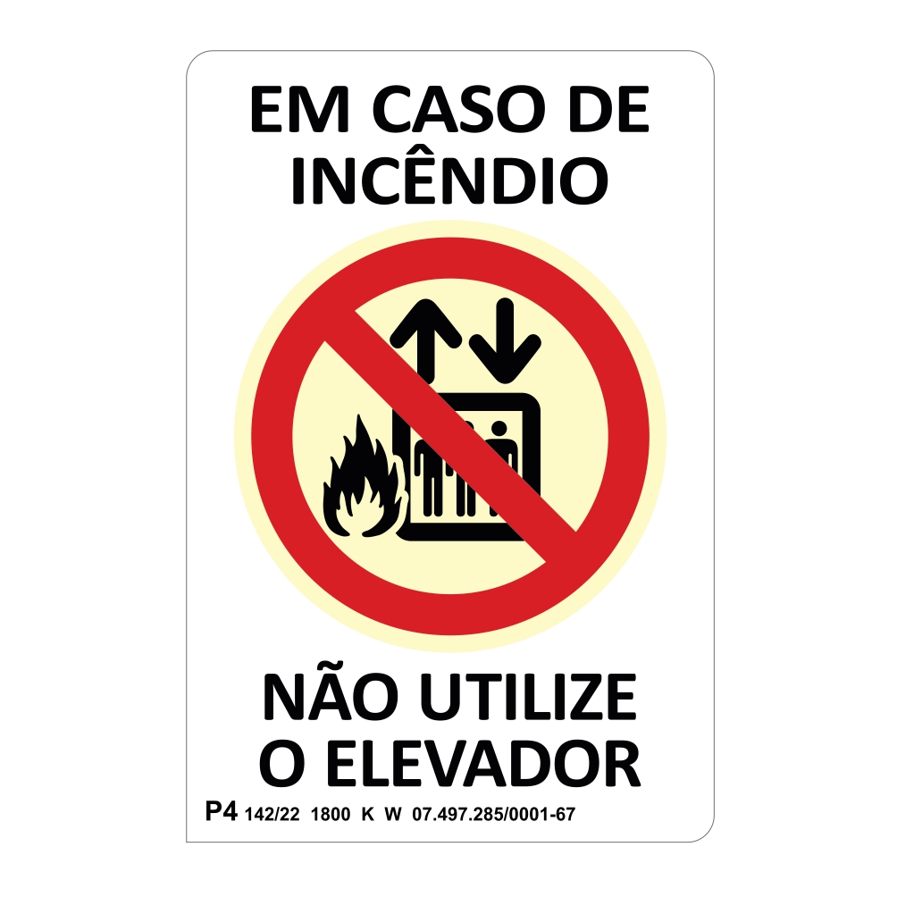 A placa de aviso para elevadores em caso de incêndio informa a proibição do uso, orientando para o uso de escadas ou rampas com o texto "EM CASO DE INCÊNDIO, NÃO UTILIZE O ELEVADOR" e possui pictogramas de proibição (circulo vermelho com barra).