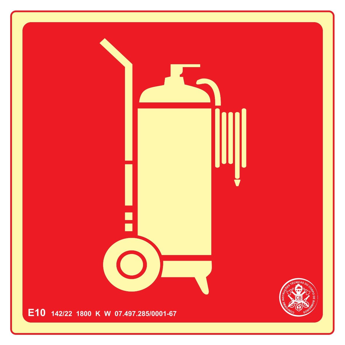 A placa E10 significa "Extintor Carreta" e serve para guiar as pessoas até um extintor do tipo carreta de grande capacidade montado sobre rodas, que é mais fácil de manusear em casos de incêndios maiores.