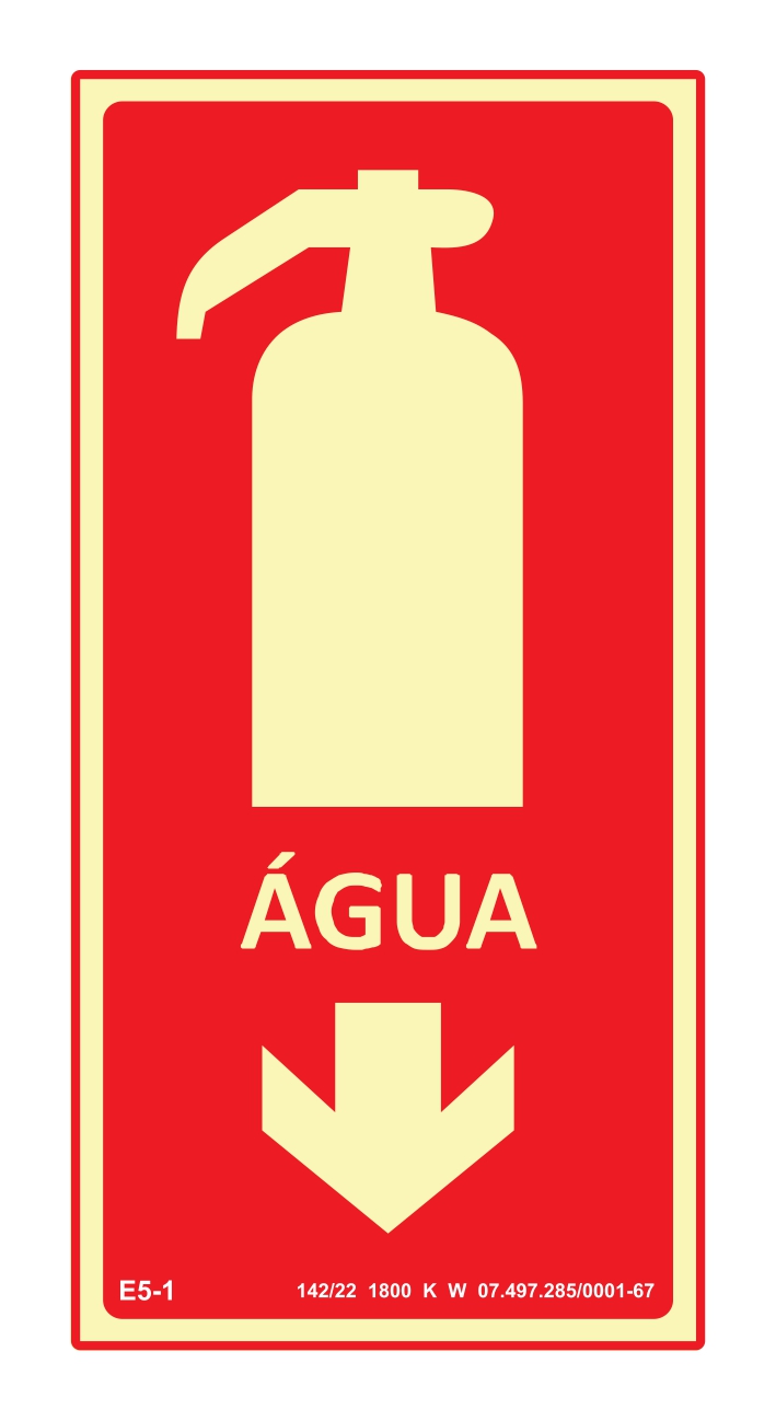 A placa de sinalização E5 -1  significa "Extintor de Incêndio com Carga de Água" e serve para identificar a localização de um extintor em uma edificação.