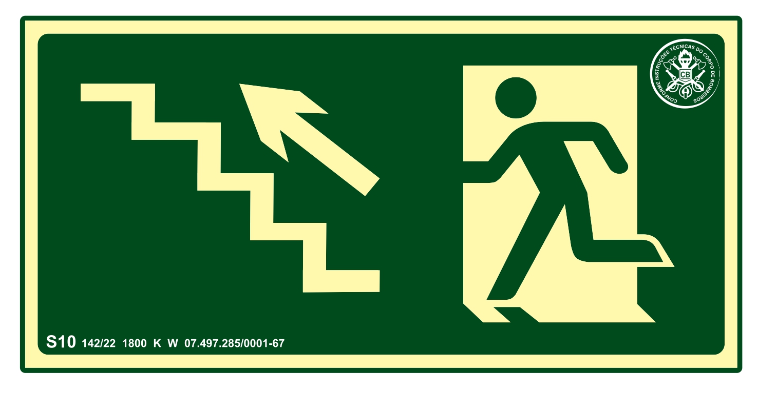 A função principal da placa S10 é indicar a direção da saída de emergência para sobe escada à esquerda em rotas de fuga. Ela é uma sinalização de orientação e salvamento, essencial para guiar as pessoas durante uma evacuação rápida em situações de emergência, como incêndios ou falta de energia.